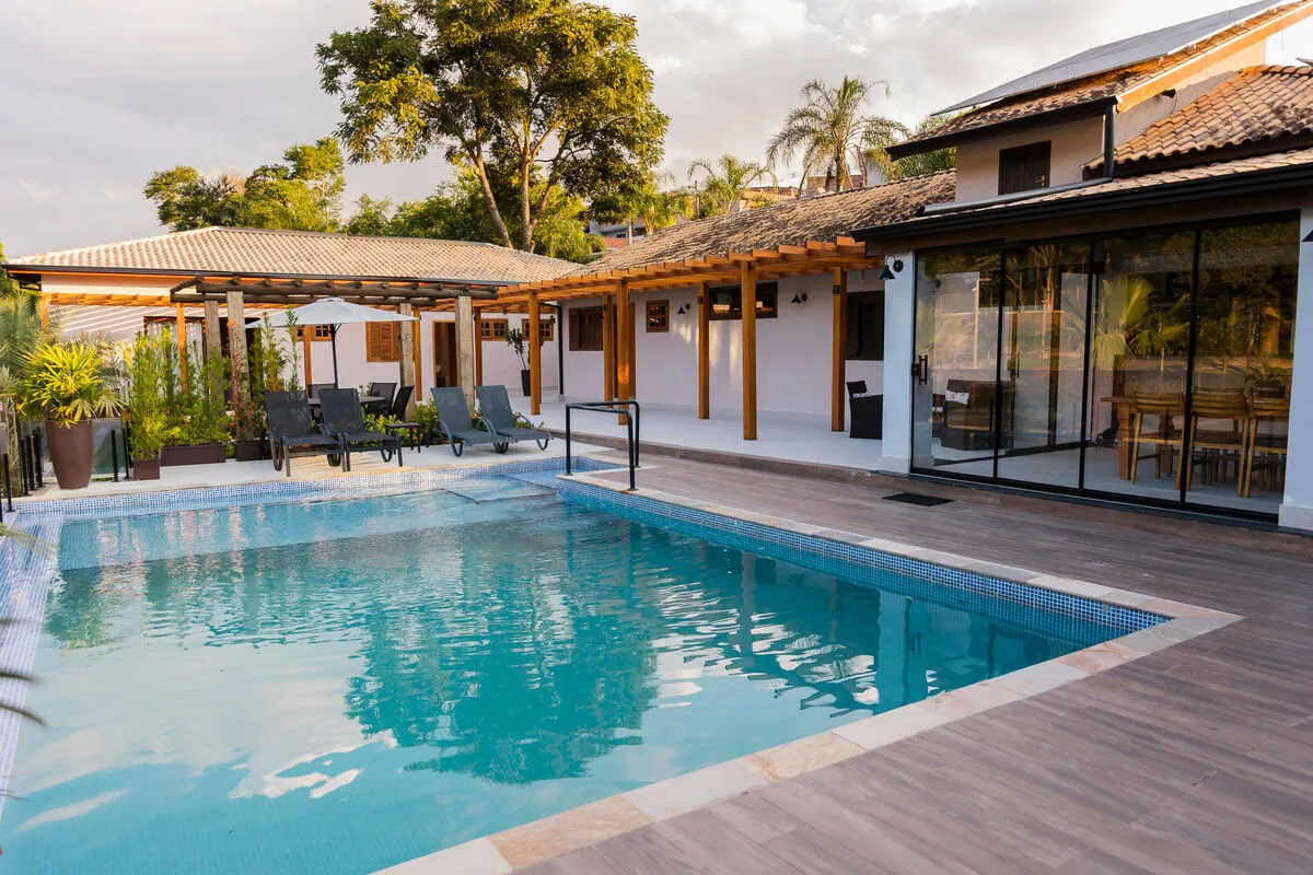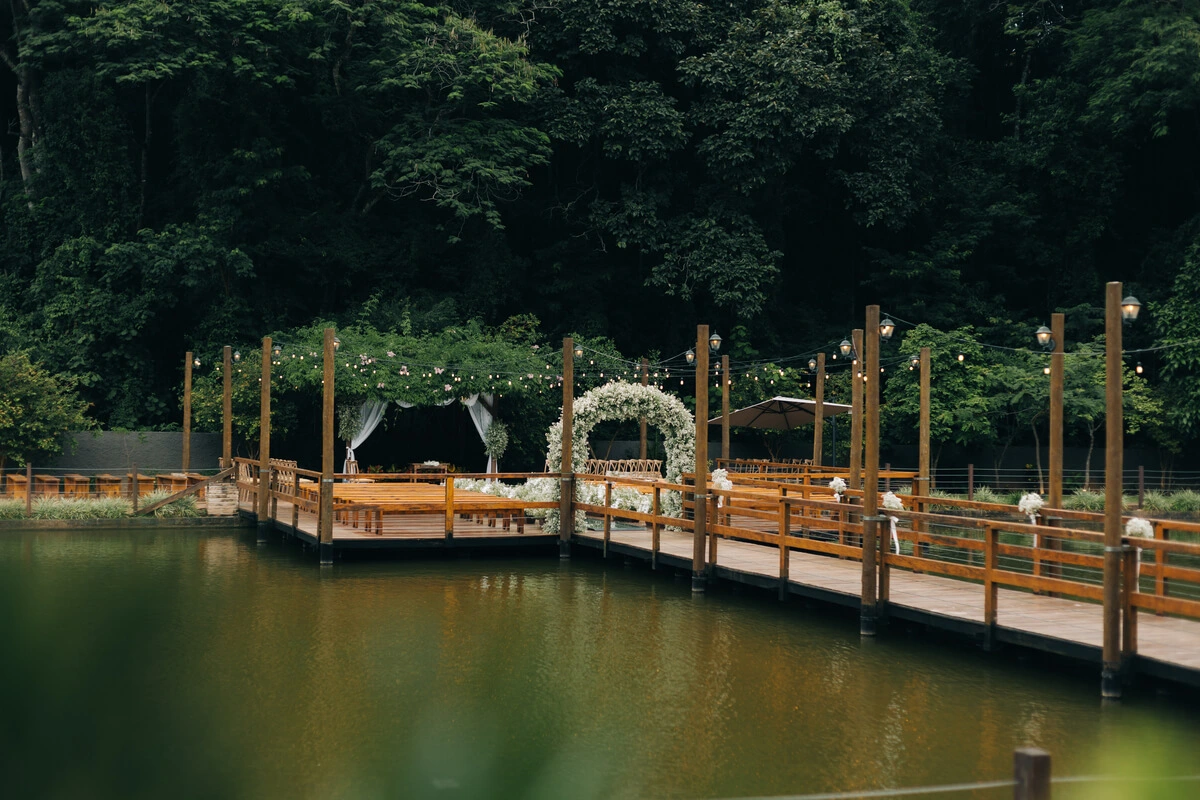 Arquitetura integrada à água e à natureza, perfeito para casamentos ao ar livre e celebrações ao pôr do sol.